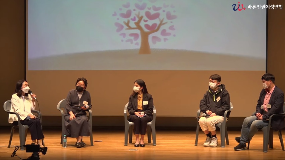 토크쇼가 진행되고 있다. (왼쪽부터) 전혜성 사무총장, 오세라비 작가, 이은송 대표, 이명준 대표, 서민 교수 ©바른인권여성연합 유튜브 캡쳐 바른인권여성연합(공동대표 이봉화·이기복)이 가정의 달을 맞아 제1회 '다시 가정으로' 캠페인을 3일 개최했다. 1부 출범식과 2부 토크쇼 순서로 진행된 이날 행사는 앞으로 매년 개최될 예정이다. 토크쇼에는 전혜성 사무총장이 사회를 맡은 가운데 서민 교수(단국대 기생충학), 오세라비 작가, 이명준 대표(한국성평화연대), 이은송 논설위원(청년스케츠)이 참여해 페미니즘, 가정의 회복 등에 대해 논의했다.
