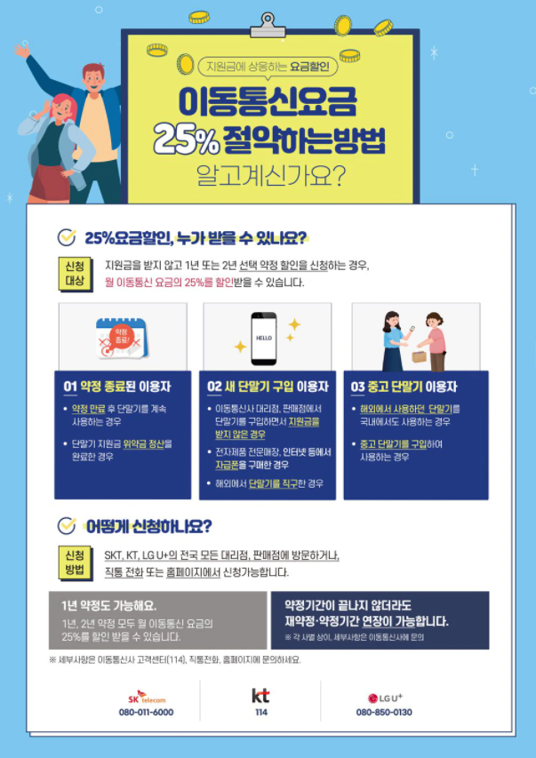 과기부는 이러한 내용을 쉽게 알 수 있도록 25% 요금 할인 홍보물을 제작해 전국 이동통신 대리점과 행정복지센터에 배포할 예정이다.