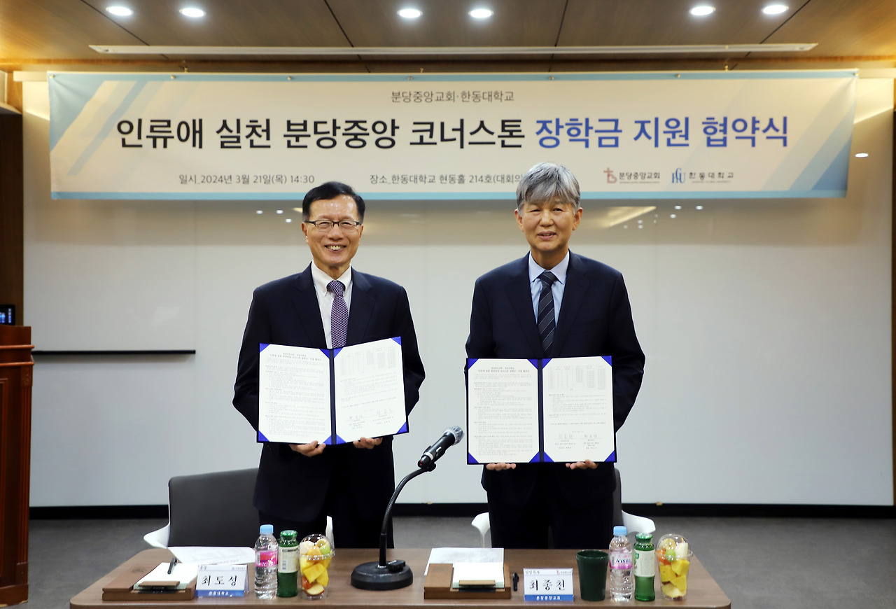 한동대와의 협약식 및 장학금 기부. 한동대 최도성 총장(왼쪽)과 최종천 목사 ©분당중앙교회 마지막으로 지난 3월 21일 한동대 현동홀 회의실에서는 한동대와 ‘인류애 실천 분당중앙 코너스톤 장학금’ 지원 협약을 체결하고, 제3세계 출신 ‘일반지도자 양성’을 위해 총 10억원을 기부하기로 했다. 사업기간은 2024년 4월부터 기금소멸시까지이며, 장학생에게는 등록금, 기숙사비, 식비로 1인당 4년(8학기) 총 5,254만2천원 가량을 지원하고, 전체 수혜 인원은 총 19명 정도가 될 것으로 예상된다.