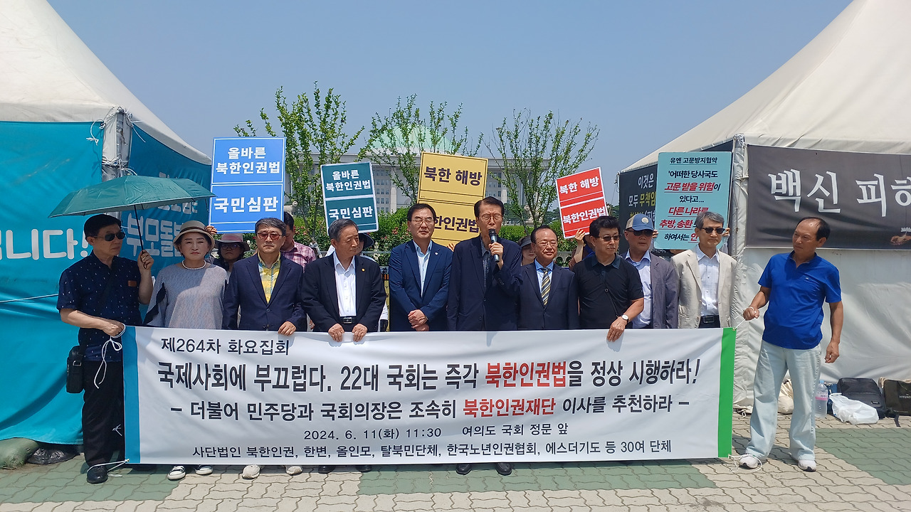 사단법인 북한인권, 한반도 인권과 통일을 위한 변호사모임(한변), 올인모, 탈북민단체, 한국노년인권협회, 에스더기도운동본부 등 30개 단체들이 11일 서울 영등포구 소재 국회의사당 앞에서 ‘