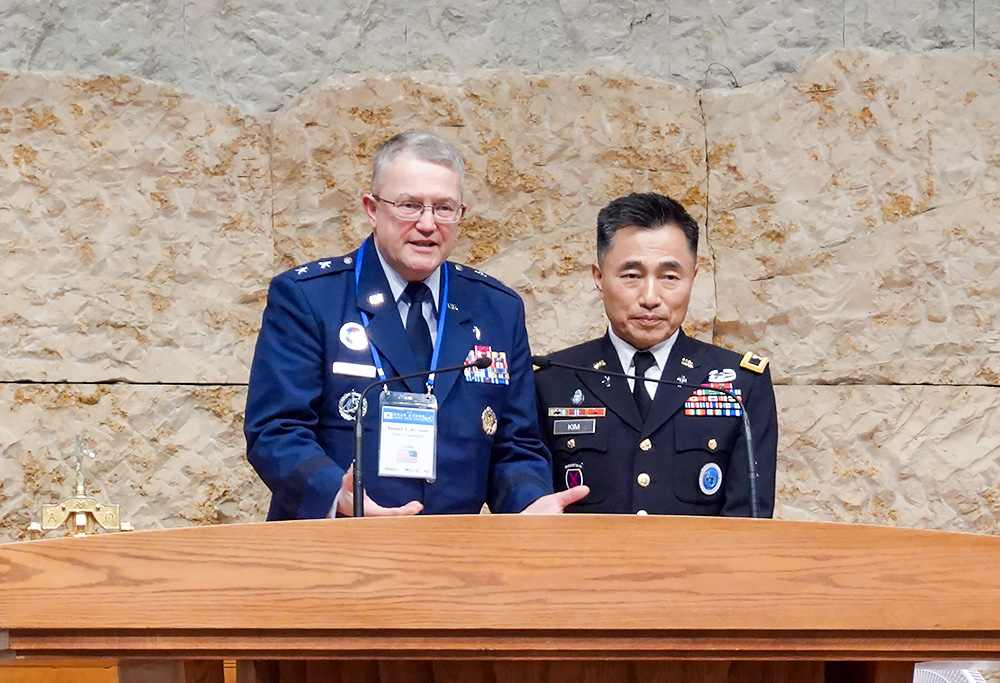 미국 공군군종감 랜달 키첸스 소장(왼쪽)이 인사를 전하고 있다. 통역은 UN 군종실장 김철우 목사(오른쪽)가 맡았다. ©이지희 기자 UN 군종 대표로 인사를 전한 미국 공군군종감 랜달 키첸스(Randall E. Kitchens) 소장은 “70년 전 전쟁터에서 전우로 있었던 저희가, 이제 한국정전 협정서가 유효하지만 전우로 동맹을 맺어 오늘까지 수고하는 것이 감사하다”며 “평화를 사랑하고 사모할 뿐만 아니라 기도하는 모든 사람과 함께, 평화를 위해 같이 기도하며 애쓰고 수고하고 있다. 하나님이 축복하시기 바란다”고 말했다.