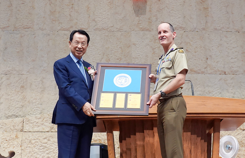 호주 군종감 케리 라윌 준장(오른쪽)이 기독교군종교구장 김삼환 목사(왼쪽)에 감사패를 전달했다. ©이지희 기자 UN 참전국 군종 대표자들은 작년에 이어 올해도 풍성한 사랑과 환대로 맞아준 군선교연합회, 명성교회에 대한 감사의 뜻을 담아 호주 군종감 케리 라윌(Kerry Larwill) 준장이 대표로 기독교군종교구장인 김삼환 목사에 감사패를 전달했다. 이후 나라와 군선교를 위한 목적기도에서 박남필 장로가 ‘나라와 민족을 위해’, 원인철 장로가 ‘국가안보와 평화통일을 위해’, 정비호 목사가 ‘한국교회와 청년선교를 위해’ 각각 기도했다.