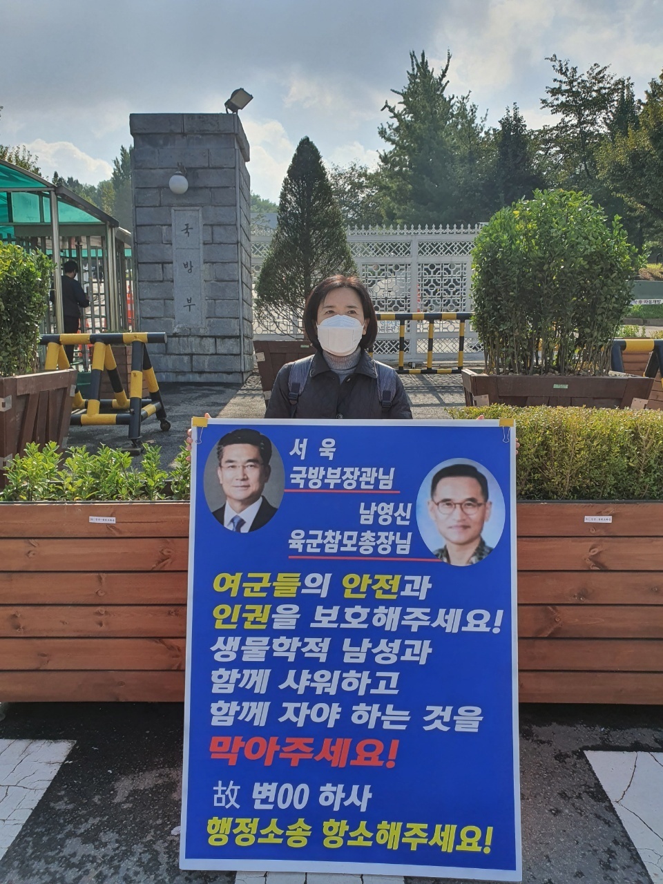 박은희 공동대표가 국방부 앞에서 피켓시위를 하고 있다. ©주최 측 제공 군 복무 중 성전환을 해 논란이 됐던 故 변희수 하사의 전역 처분이 부당하다는 대전지법 행정2부(부장판사 오영표)의 판결에 대해, 50여 개 시민단체들이 법치주의를 훼손했다며 “육군·국방부는 군기강 무력화 판결에 즉각 항소하라”고 촉구했다.