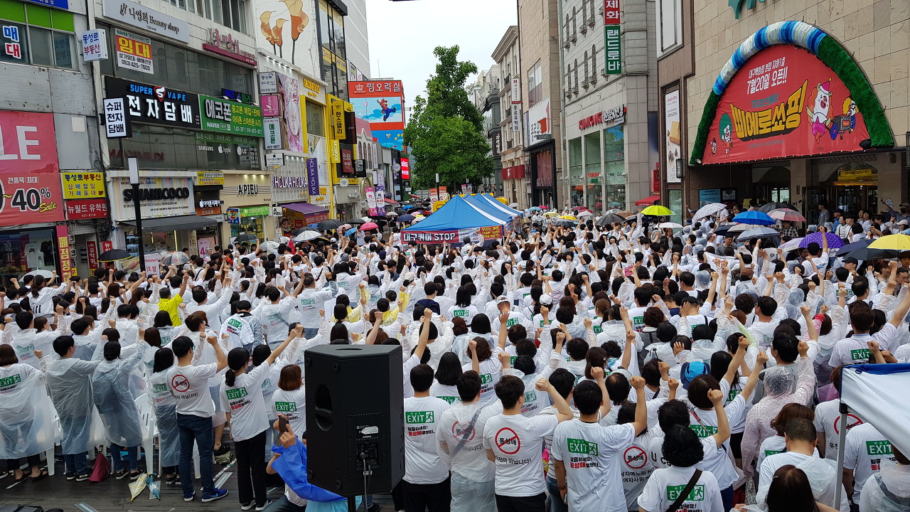 지난 2019년 대구에서 퀴어문화축제가 열렸던 당시 축제에 대한 반대집회가 열리던 모습 ©대구경북다음세대지키기학부모연합 그러나 이 지역 학부모 단체는 퀴어축제 퍼레이드의 대면 개최를 강력히 반대하고 나섰다.